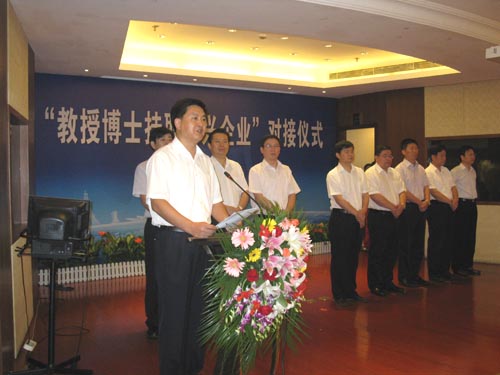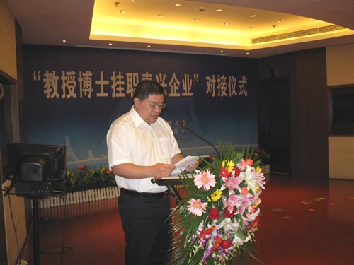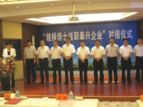 圖為泰州市委常委、組織部部長陸新講話 (記者 馬宏飛 特約記者 肖春華)8月16日上午,市委、市政府舉行“教授博士掛職泰興企業(yè)”對(duì)接儀式,聘請(qǐng)來自江蘇科技大學(xué)、浙江大學(xué)等國內(nèi)26所高等院校的78名教授、博士到我市30多家企業(yè)掛職。