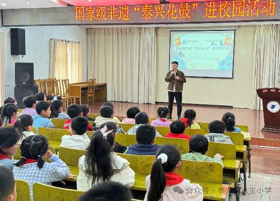 知花鼓 傳文化 “泰興花鼓”進(jìn)校園活動由小主持人對泰興市文化館的專家——“泰興花鼓”第八代傳承人胡盛主任的介紹拉開序幕。