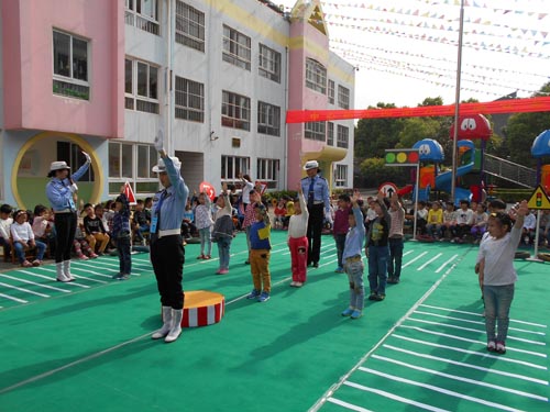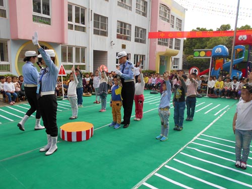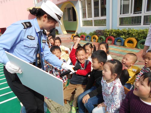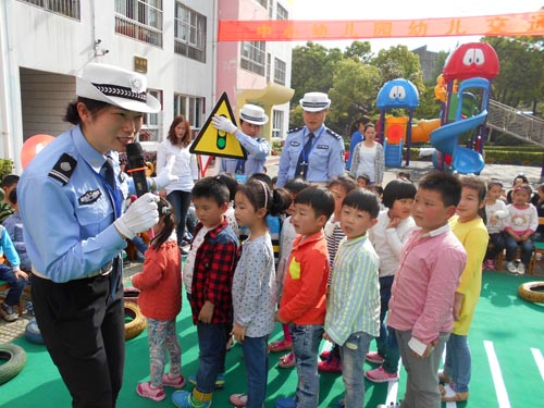 為了進一步落實交通安全宣傳從娃娃抓起,5月6日下午 “全國巾幗文明崗”——江蘇省泰興公安交警大隊女子班的“警花“們來到泰興市中心幼兒園開展道路交通安全宣傳活動。她們?yōu)橹行挠變簣@的小朋友設(shè)置了模擬交通路口、紅綠燈、交通標志標線,和小朋友一起做交通安全小游戲、開展交通指揮手勢表演、交通安全有獎競答、交通標志圖片識別,通過系列的活動使小朋友們認識交通、體驗交通、了解交通、關(guān)注交通,同時教育了小朋友們在日常的生活中注意交通安全;顒庸灿300余名師生參加,受到了孩子們喜愛。( 張繼軍 黃新麗)