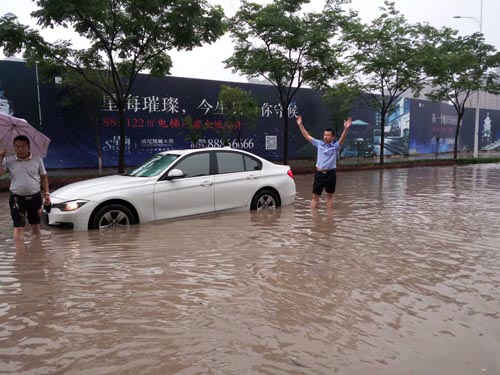 鼓樓北延路段,由于周圍的建筑工地施工,水深一度達到40厘米,數(shù)十輛機動車在水中停滯,為了讓司機放心地安全通過,郭建中打開下水道井口蓋排泄積水,并跳進泥沙渾濁的積水中,指導(dǎo)駕駛?cè)讼ɑ穑砷_手剎,扶好方向盤,自己則到車后幫助他們推車,最大限度地降低車輛損失。
