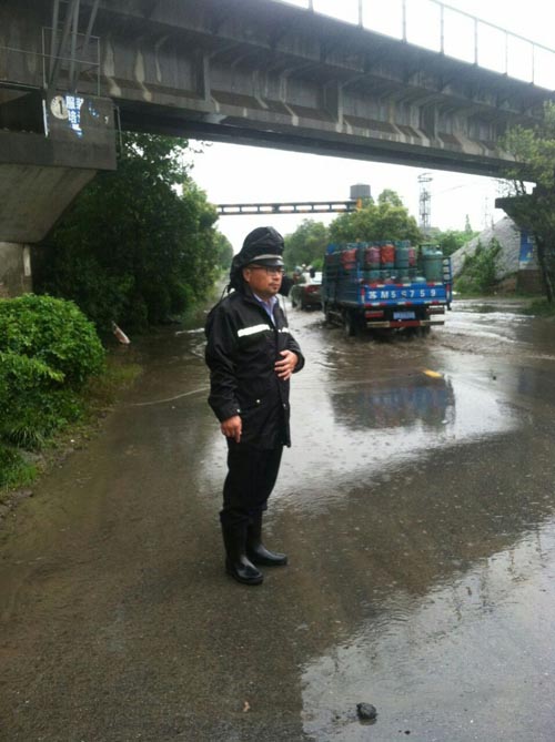 2日上午7時,正在關(guān)注微信的泰興公安交警大隊城區(qū)中隊中隊長王文宏在微信中看到市民發(fā)來的照片,大慶路、羌溪路部分路段出現(xiàn)積水,影響車輛通行。雨情就是警情,雨情就是命令。他迅速電話動員,果斷啟動中隊惡劣天氣處置預(yù)案,帶領(lǐng)全隊民警主動出擊、積極應(yīng)對,雨中堅守路面執(zhí)勤一線。特別是大慶路、羌溪路等路段積水嚴(yán)重,羌溪路鎮(zhèn)海門橋下的低洼處積水超過了15厘米,他利用口哨、喊話器提醒過往車輛減速慢行,指揮、疏導(dǎo)車輛有序通行,雖然積水漫過了他的雙腳,可他全然不顧,與過往車輛“零距離”接觸,扯開嗓門一遍又一遍的叮囑駕駛?cè)吮3职踩囁。而與此同時,他的褲兜里一遍一遍地響起家里的電話,在20公里外的黃橋,70多歲的父母家里,因暴雨侵濁屋頂多處發(fā)生漏雨……最后,引以為傲、穿警服的大兒子沒回家,倒是在工廠忙碌的弟弟心急火燎地往家趕。