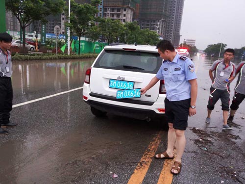 雨勢已轉(zhuǎn)弱,但陣雨不斷,路面還有很多積水以及數(shù)厘米厚的淤泥。當(dāng)看到一輛輛熄火的從水中推出的汽車,當(dāng)看到一排排警示樁在馬路上擺出,還有一個個身著濕噠噠的警服在雨中矯健的身影,所有這些無不在告訴我們所有人:風(fēng)在、雨在、交警蜀黍也在。 |