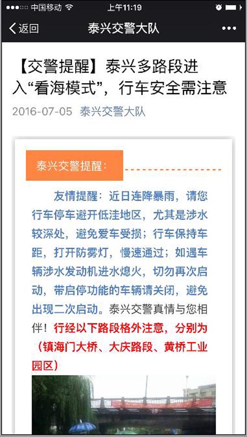 風(fēng)在、雨在,泰興交警蜀黍也在!“駕駛員朋友們,近日連降暴雨,請您行車停車避開低洼地區(qū)……”“目前泰興市區(qū)發(fā)現(xiàn)重點積水路面有古墩線古溪鐵路大橋等共6處,請車輛駕駛?cè)死@行,感謝您的配合,泰興交警與您相伴。”一條條短信、微信、語音小喇叭一瞬間全面鋪開,朋友圈、微信群,一張張危險路段訊息在時時提醒。各基層交警中隊人員全部上路,排除險情,人手不夠時,抽調(diào)友鄰中隊人員互幫互助;同時又各自為陣,在轄區(qū)所有主次干道來回巡邏,檢查交通標(biāo)志、隔離欄的損毀情況,密集注意險橋、險段等交通安全隱患,清理路面樹枝、砂石,設(shè)置警示標(biāo)牌及臨時警示措施,確保過往車輛安全。僅3日一天,緊急排險15處,定點疏導(dǎo)交通31處,發(fā)送短信提醒16條,接收轉(zhuǎn)發(fā)、微信群眾約3萬余人。