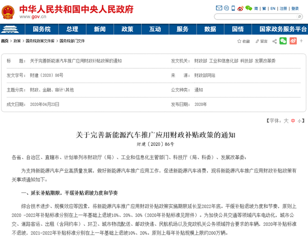 △《關(guān)于新能源汽車免征車輛購置稅有關(guān)政策的公告》。 購買新能源車的補貼也是同理。根據(jù)國家財政部、工業(yè)和信息化部、科技部、發(fā)展改革委2020年4月23日發(fā)布的《關(guān)于完善新能源汽車推廣應(yīng)用財政補貼政策的通知》,“綜合技術(shù)進步、規(guī)模效應(yīng)等因素,將新能源汽車推廣應(yīng)用財政補貼政策實施期限延長至2022年底。平緩補貼退坡力度和節(jié)奏,原則上2020 -2022年補貼標(biāo)準(zhǔn)分別在上一年基礎(chǔ)上退坡10%、20%、30%(2020年補貼標(biāo)準(zhǔn)見附件)。”也就是說,至少在2022年年底前,購買新能源車符合技術(shù)要求的均可以享受到補貼。