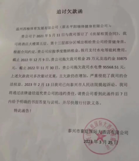 從該函中可見 健身中心拖欠酒店租金25萬元 違約金3萬3千余元 水電費(fèi)9萬5千余元