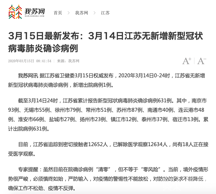 官宣:“動態(tài)清零”!剛剛(3月15日上午8時40分),江蘇省衛(wèi)健委發(fā)布:3月14日0時-24時,江蘇省無新增新型冠狀病毒肺炎確診病例,新增出院病例1例,累計出院病例631例,尚有18人正在接受醫(yī)學觀察。目前,江蘇省在院確診病例“清零”。