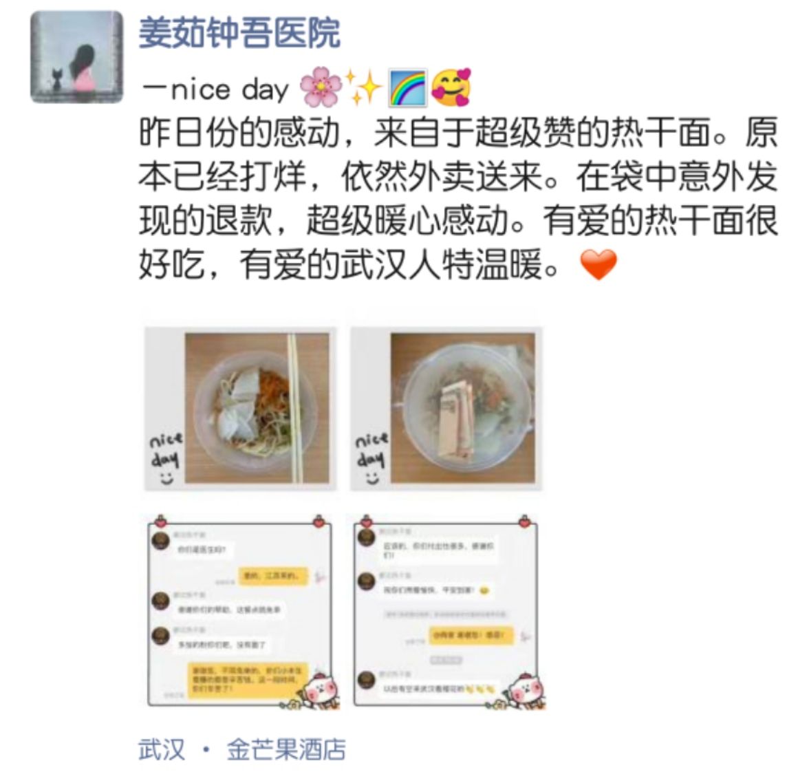姜茹發(fā)的微信朋友圈 “那天大家商量,晚上吃熱干面,當?shù)氐尼t(yī)生為我們推薦了一家面館。下單后,我忘記提交了。下午4點左右,再準備付款時,發(fā)現(xiàn)已經(jīng)打烊了。”3月23日上午,宿遷市鐘吾醫(yī)院醫(yī)務(wù)人員姜茹說,武漢的外賣剛剛恢復(fù)營業(yè)不久,她想著有的商家會因為訂單多忙不過來,店鋪會開一會兒關(guān)一會兒。姜茹抱著試試看的心理,撥打了這家面館的電話。 “請問一下,今天還有熱干面嗎?” “如果您想吃的話,明天9點再訂哦!你們是醫(yī)生嗎?” “是的,江蘇來的!” “謝謝你們的幫助!面不多,還有粉!”