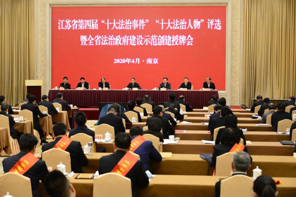 4月29日,江蘇省委全面依法治省委員會辦公室召開會議,貫徹落實省委全面依法治省委員會第三次會議精神,發(fā)布省委依法治省辦會同省委宣傳部、省司法廳聯(lián)合開展的江蘇省第四屆“十大法治事件”“十大法治人物”評選結(jié)果,為全省法治政府建設(shè)示范單位授牌。