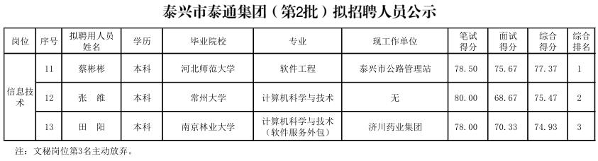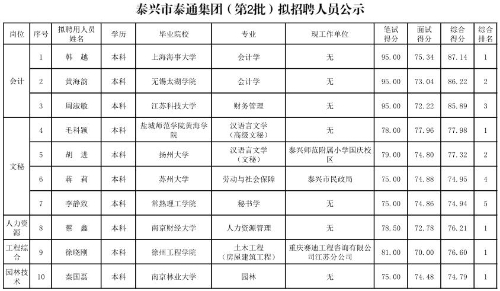泰興市泰通集團(tuán)(第2批)擬招聘人員公示表