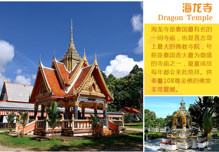 于指定時間集合后前往【珠寶展示中心&海洋水族館】,普吉島的珠寶工廠歷史悠久,規(guī)模巨大,正規(guī)。是整個泰國范圍內(nèi)數(shù)一數(shù)二的珠寶中心。這里融合珠寶的研究,制造和批發(fā)于一體,是名符其實(shí)的珠寶工廠。這里也被規(guī)劃成為一個具教育,娛樂,購物,展覽于一體的大型綜合性區(qū)域。當(dāng)然啦,這家店也是眾多世界名流挑選珠寶的首選之地,英國的凱特王妃,好萊塢的眾多明星,都喜歡在這里購買他們心儀的珠寶。如果說鉆石的切割技術(shù)歐洲第一的話,那泰國的珠寶工藝更可謂舉世無雙。在這里匯集了全泰國最好的寶石切割工匠和設(shè)計(jì)家,將各種寶石的原石變成一個個曠世驚嘆的傳奇之作。當(dāng)然啦,各種不同的珠寶也代表了不同的寓意。藍(lán)寶石是財富和身份的象征,紅寶石是尊貴和愛情的見證,黃寶石是財運(yùn)和富足的代表。泰國人設(shè)計(jì)和出售珠寶講究的都是緣分,昂貴的價格也使珠寶成為頂級奢侈品之一,各位可以逛逛參觀,或者乘坐他們新造的小火車博物館和小型海洋水世界。后帶領(lǐng)各位先游覽普吉的【海龍寺】,膜拜有求必應(yīng)的四面佛。