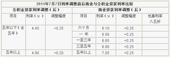 2011年7月7日利率調整前后商業(yè)與公積金貸款利率比較
