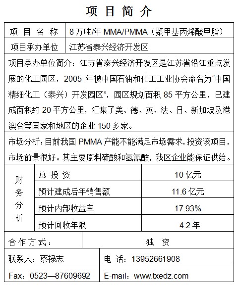 8萬噸/年MMA/PMMA(聚甲基丙烯酸甲脂)