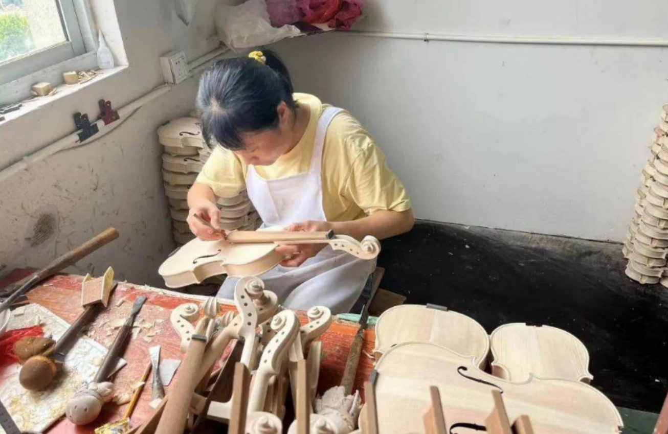 人民參與特色產(chǎn)業(yè)發(fā)展,發(fā)展成果由人民共享。今年“6.21國際樂器演奏日”活動后,鳳靈樂器有限公司各大車間有點忙。在裝頭車間,今年46歲的向春美,熟練地用刀削切琴身頂端的凹槽,并不停地將琴頭按上進行比對,確保琴頭的榫頭與凹槽完全吻合。她一天能裝100到150只琴頭,每月收入3000元到4000元。“提琴制作有120道工序,去年生產(chǎn)大、小琴近20萬把。今年的訂單來不及做,我們正加班加點。”鳳靈樂器有限公司行政部長何永承介紹。