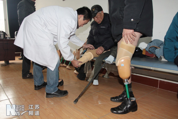 工作人員現(xiàn)場(chǎng)給殘疾人裝假肢 |