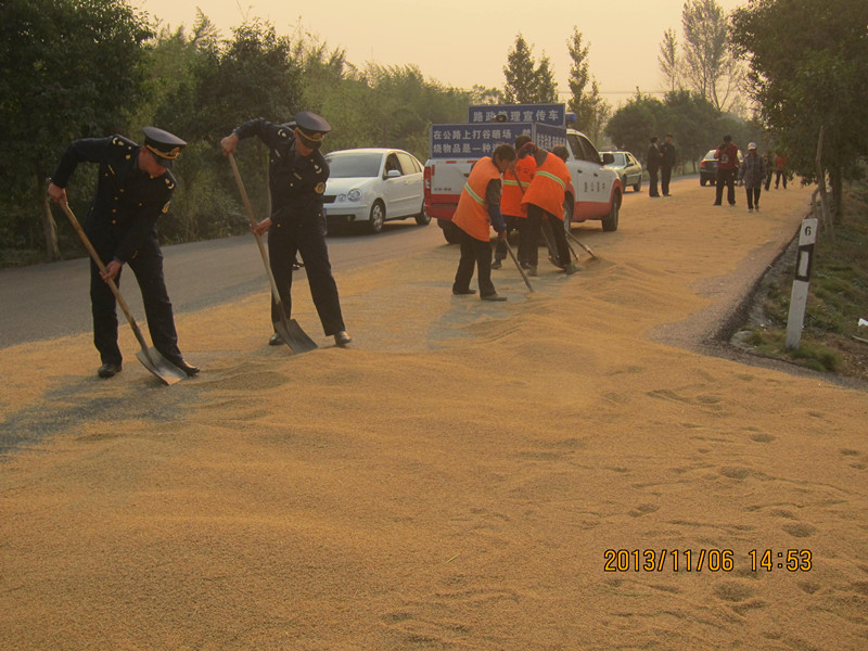 為全面徹底整治曬糧現(xiàn)象, 11月6日,泰興公路站聯(lián)合泰興交運(yùn)局、曲霞交管所、蔣華工區(qū),對(duì)所管轄的珊七線路段大面積占道曬糧現(xiàn)象進(jìn)行了一次專項(xiàng)整治,并邀請(qǐng)?zhí)┡d電視臺(tái)進(jìn)行了跟蹤報(bào)道。此次專項(xiàng)整治的目的一是維護(hù)路容路貌,二是促進(jìn)道路的交通安全,三是提高群眾的法制意識(shí)。對(duì)此,路政執(zhí)法人員現(xiàn)場說法,并幫助群眾清收稻谷,共計(jì)清除大面積占道曬糧7處,受到了過往行人車輛的一致好評(píng)。