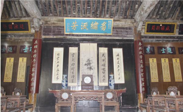 何氏宗祠議事廳。 豸繡流芳, 豸繡指 監(jiān)察、執(zhí)法官,大概指向何氏宗祠的創(chuàng)建者 何斐,他的職務(wù)是御史。 廳堂正中一間,陳設(shè)紅木太師椅和茶幾。 |
