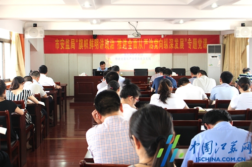 | 中國江蘇網(wǎng)7月24日泰州訊 為切實(shí)增強(qiáng)全體黨員干部旗幟鮮明講政治的思想自覺和行動自覺,近期,泰興市安監(jiān)局黨支部書記為全體機(jī)關(guān)干部上了一堂題為《旗幟鮮明講政治,推進(jìn)全面從嚴(yán)治黨向縱深發(fā)展》的專題黨課。