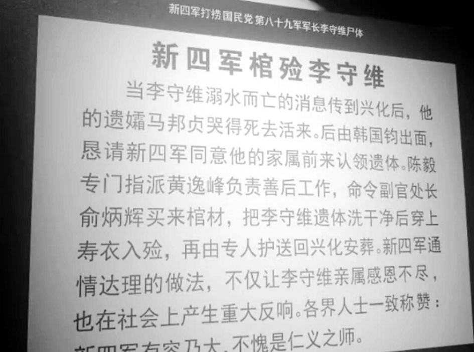 黃橋決戰(zhàn)打響后,新四軍駐黃橋7000將士,在陳毅親自指揮之下,浴血抗擊來犯的李守維部,戰(zhàn)斗持續(xù)進(jìn)行了3天3夜。眼見自己的部隊(duì)節(jié)節(jié)潰敗,李守維從斷后的督軍,變成了潰逃的尖兵,急切之中,他穿上士兵的衣服從姜黃公路逃命而去,途中,失足跌入河中淹死。這樣一個人可以說是死有余辜,陳毅為什么還要棺殮他呢?