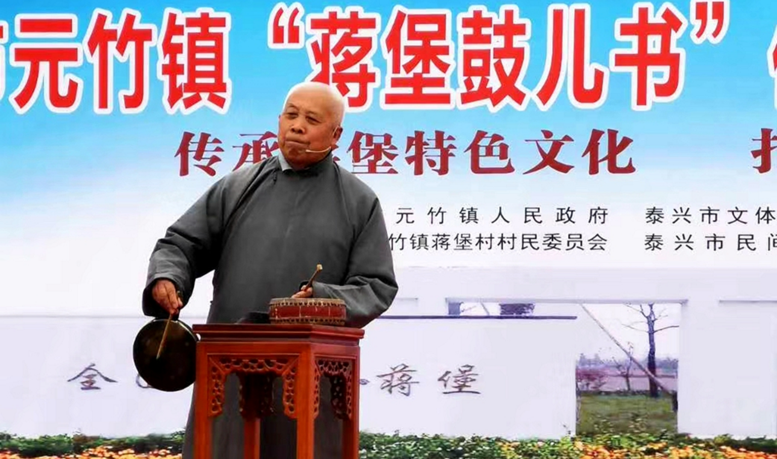 2018年11月,“泰興鼓兒書蔣堡書場啟動儀式”在蔣堡村舉行,泰興鼓兒書的代表性傳承人悉數(shù)到場。“鼓兒一敲咚咚咚,銅鑼一打當(dāng)當(dāng)當(dāng)。今天不把別的唱,夸夸蔣堡好地方。水清岸綠樹成行,晚上散步亮堂堂。遠(yuǎn)望家家住洋房,近看戶戶達(dá)小康。”民間藝人即興編詞,激情獻(xiàn)藝。