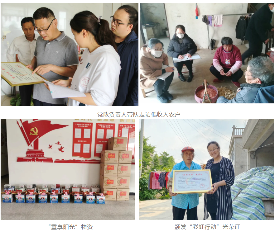 開啟橙色關(guān)懷 提高幫扶暖心度 黨政主要負(fù)責(zé)人帶頭,定期到建檔立卡低收入農(nóng)戶家中走訪慰問,幫助解決實(shí)際困難。組建“1+1+1”扶貧結(jié)對小組,確保每1戶貧困戶都有1名黨代表和1名村干部進(jìn)行幫扶,并以銀杏義購、基金扶持等形式,幫助貧困戶“富口袋”。動員各行各業(yè)優(yōu)秀青年共同參與“童享陽光”困境青少年幫扶行動,開展系列活動7場,為貧困兒童送去愛心物資。設(shè)立“彩虹行動”幫扶基金,按人均收入8200元以下、8200-8500元、8500元以上三檔分批次開展獎勵(lì)性幫扶和激勵(lì)性幫扶,為享受該幫扶基金的低收入戶頒發(fā)“彩虹行動”光榮證、“彩虹行動”榮譽(yù)證。