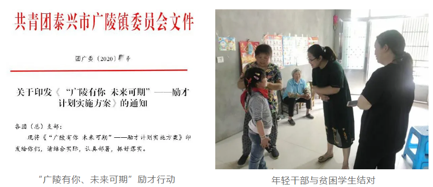 增添青色關(guān)愛 阻斷貧困代際傳 在鎮(zhèn)黨委的領(lǐng)導(dǎo)下,鎮(zhèn)團(tuán)委向全鎮(zhèn)廣大青年發(fā)出“脫貧攻堅(jiān)黨旗紅,青年建功做先鋒”的號召,開展“廣陵有你、未來可期”勵(lì)才行動。16名年輕干部主動與品學(xué)兼優(yōu)的貧困學(xué)生結(jié)對,成為青少年的“成長伙伴”。通過開展思想引導(dǎo)、學(xué)業(yè)幫扶、生涯規(guī)劃、合理資助等,不斷激發(fā)貧困學(xué)生“知識改變命運(yùn)”的內(nèi)生動力,切實(shí)阻斷貧困代際傳遞。