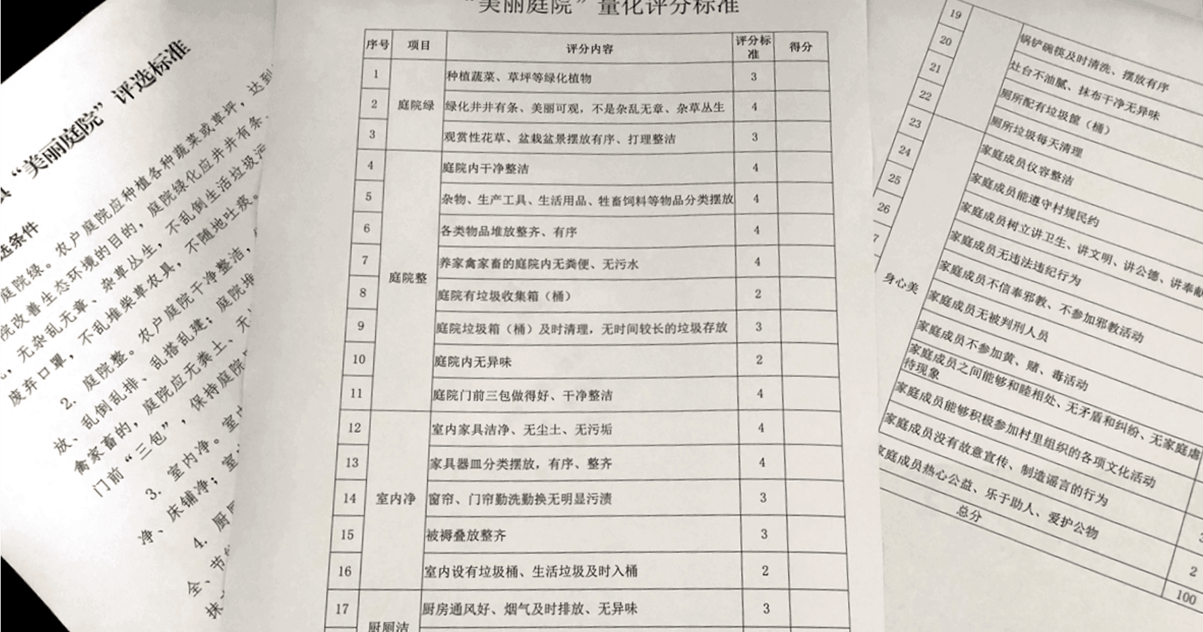 一份測評表 本著“量化、客觀、公正”的原則,“美麗庭院”以農(nóng)戶為單位,將“美麗庭院”創(chuàng)建分為五項量化要素:庭院綠、庭院整、室內(nèi)凈、廚廁潔、身心美,實行計分評比。最終根據(jù)積分高低確定名單,并對“美麗庭院”的農(nóng)戶進行掛牌及物質(zhì)獎勵。明確、細化評選要素,不僅便于評選公正,更加利于農(nóng)戶對照標準進行整改,豐富庭院、美麗生活。