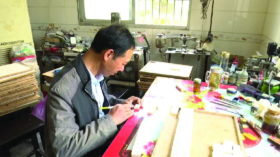●泰興麻將雕刻● 麻將雕刻工藝自二十世紀(jì)三十年代初,從香港、蘇州雕刻工藝品廠傳入。由一開始單純的竹片雕刻發(fā)展到水牛骨、絲竹、亞克力、牛角、紅木等高檔雕刻。麻將又稱雀牌,是雕刻工藝品,工藝流程較為復(fù)雜,凡人物肖像、萬壽圖等特殊工藝品必須手工雕刻,造型、作色復(fù)雜,制作時(shí)間長,要求字、畫清晰,表面光滑,肖像造型逼真,活靈活現(xiàn),是機(jī)械雕刻所不能替代的絕妙工藝。所有工藝必須通過鋸、削、鉆、磨、刨、滾等工序,從粗到細(xì)達(dá)到精的生產(chǎn)過程。 劉軍是泰興張橋麻將工藝精品傳承骨干之一,二十多年來,一直從事《三國演義》、《水滸傳》、《紅樓夢》、《西游記》人物肖像雕刻,從未間斷。