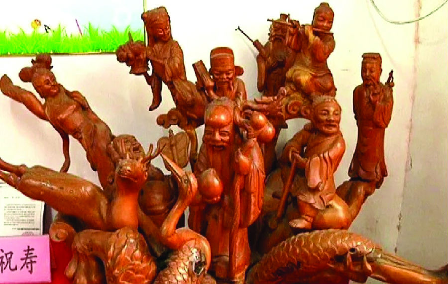 ●泰興銀杏木雕● 根雕藝術(shù)起源于唐朝,多見于寺廟、明清盛行。選購適合的銀杏樹根,去皮后置水浸數(shù)月,撈出陰干,根據(jù)造型構(gòu)思。經(jīng)精細(xì)圓雕、鏤雕、拼雕等多種手法加以創(chuàng)作,成形后打磨、刨光、上漆或打蠟。根雕的題材,多為吉祥如意、宗教信仰內(nèi)容,主要用于室內(nèi)裝飾和收藏等。