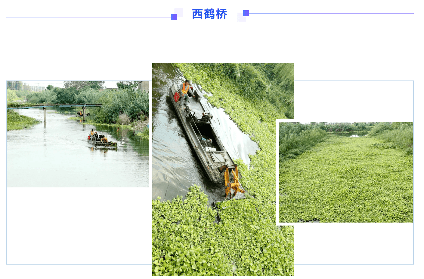 河失鎮(zhèn)司馬中溝爆發(fā)性增長(zhǎng)的水生植物,幾乎覆蓋了整條河道,機(jī)械化保潔船不斷放下抄網(wǎng)進(jìn)行清理,船后是一百多米已經(jīng)清理干凈的河面。