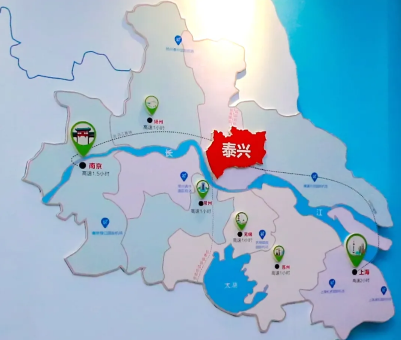 泰興因江而生、依江而興,擁有1172平方公里地域,下轄16個(gè)鄉(xiāng)鎮(zhèn)(街道)、3個(gè)省級(jí)開(kāi)發(fā)區(qū)、3個(gè)市級(jí)園區(qū)。萬(wàn)里長(zhǎng)江向東奔流,流入泰興昂首向南,然后拐彎向東、直奔大海,24.2公里的長(zhǎng)江岸線將泰興鑲嵌其中,呈現(xiàn)出一個(gè)“聚寶盆”似的“弧形洼地”。