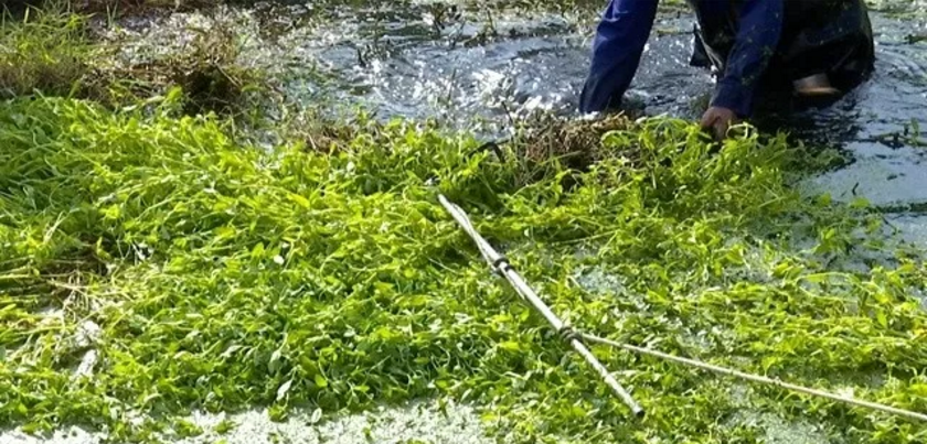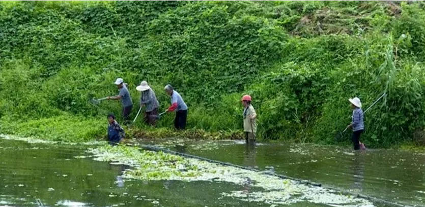 蔡亞飛、張仁賢的作業(yè)小船上沒(méi)有遮陽(yáng)設(shè)備,他們戴著一頂草帽,小船在河面上緩緩前行,看到水面上漂浮著的水生植物,就停下來(lái)用網(wǎng)打撈。汗水不斷地從毛孔里滲出,他們?cè)缫押沽鳑驯场?/span>