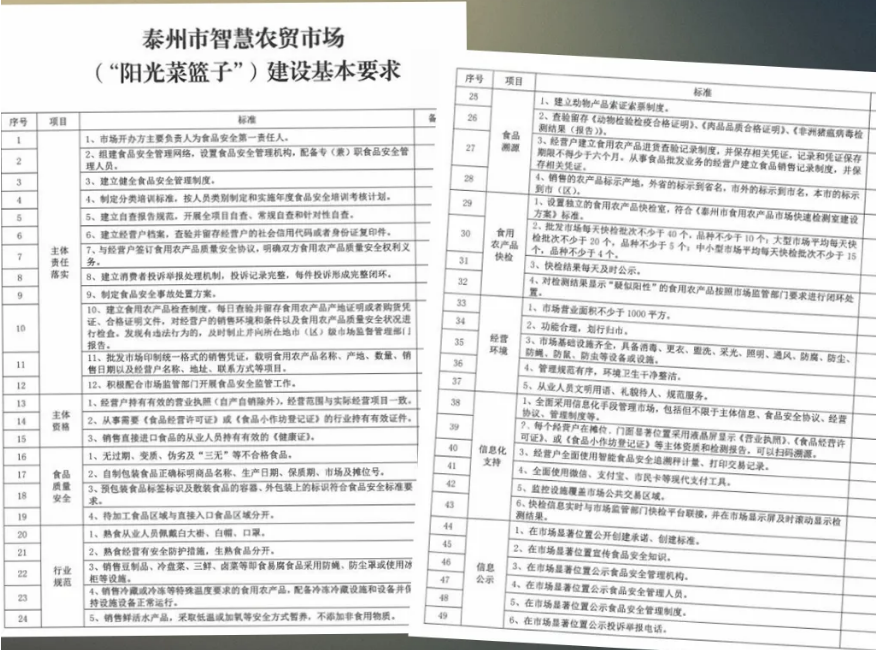 根據(jù)方案,智慧農(nóng)貿(mào)市場(chǎng)(“陽光菜籃子”)建設(shè)基本要求涉及主體責(zé)任落實(shí)、主體資格、食品質(zhì)量安全、行業(yè)規(guī)范、食品溯源、食用農(nóng)產(chǎn)品快檢、經(jīng)營(yíng)環(huán)境、信息化支持和信息公示等方面,進(jìn)一步提高從市場(chǎng)到餐桌全過程的監(jiān)管能力,提升農(nóng)貿(mào)市場(chǎng)供給和全鏈條質(zhì)量安全保障水平。