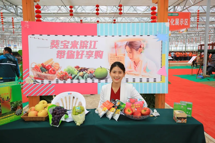 車?yán)遄、紅心獼猴桃、翠冠梨、有機(jī)大米、色拉油,還有蒲地藍(lán)……濱江特產(chǎn)擺滿了直播桌。