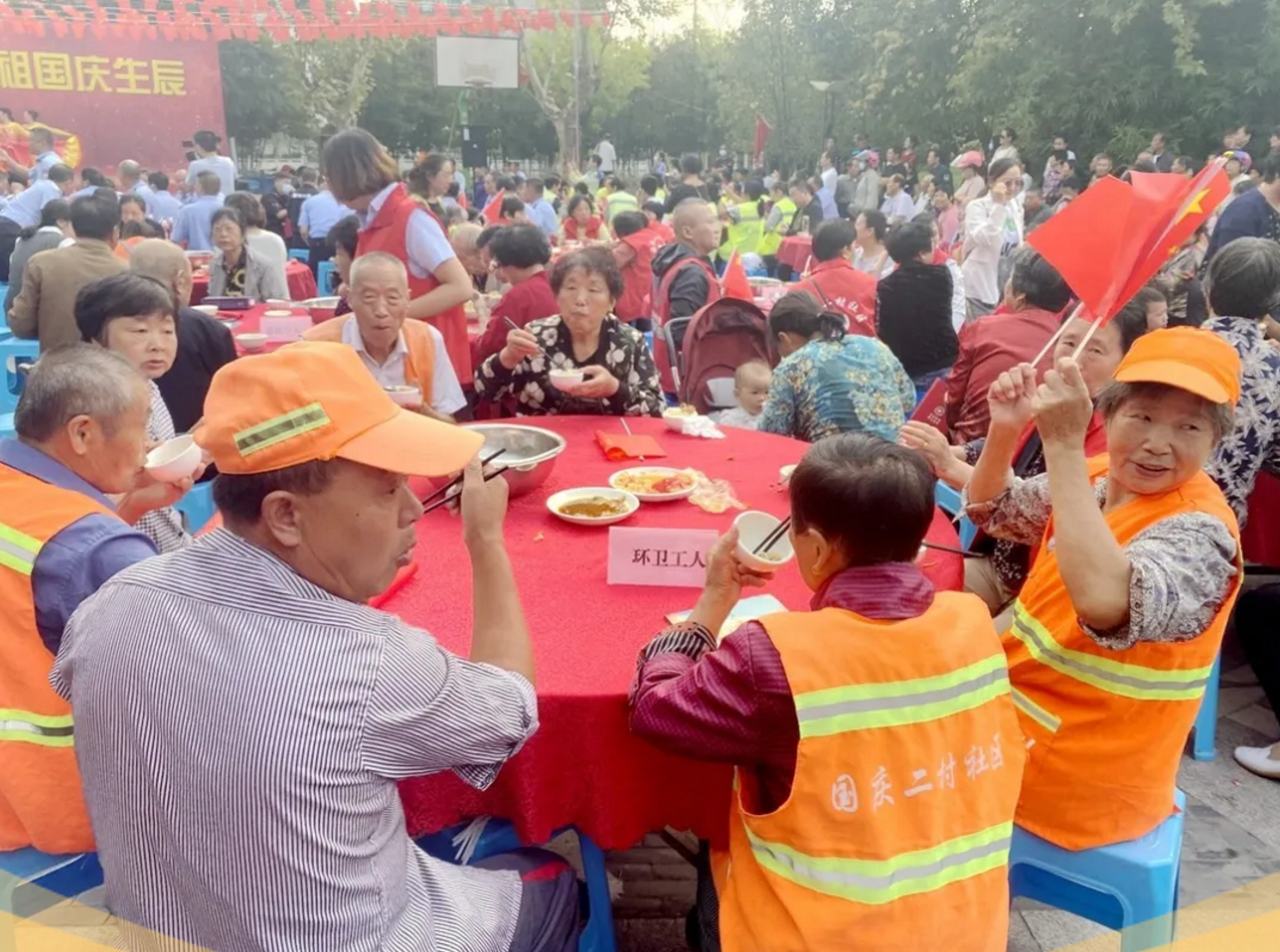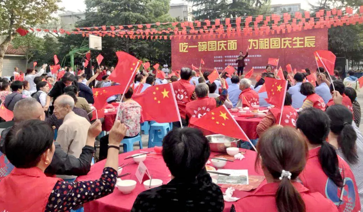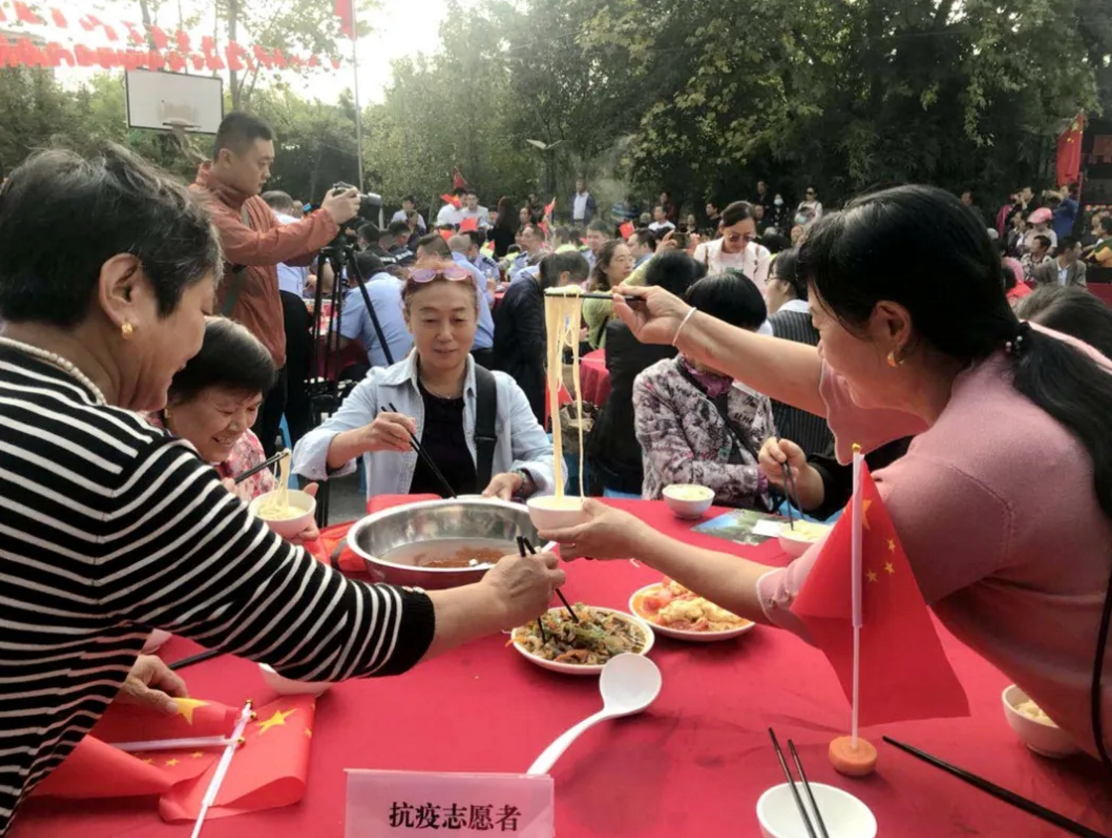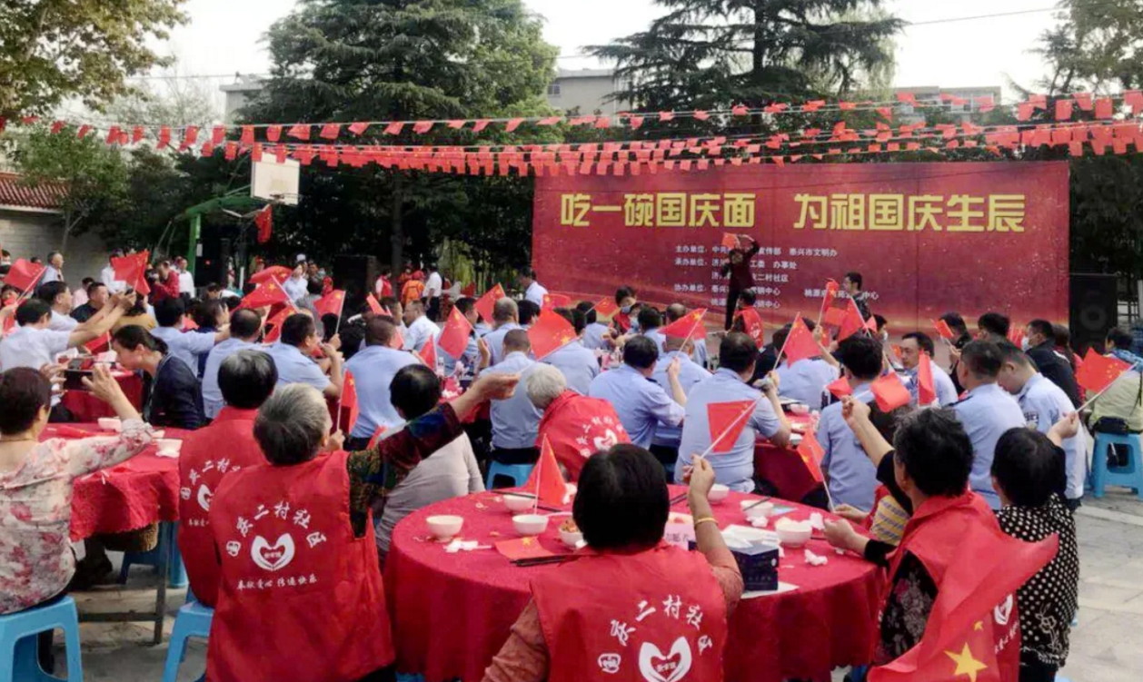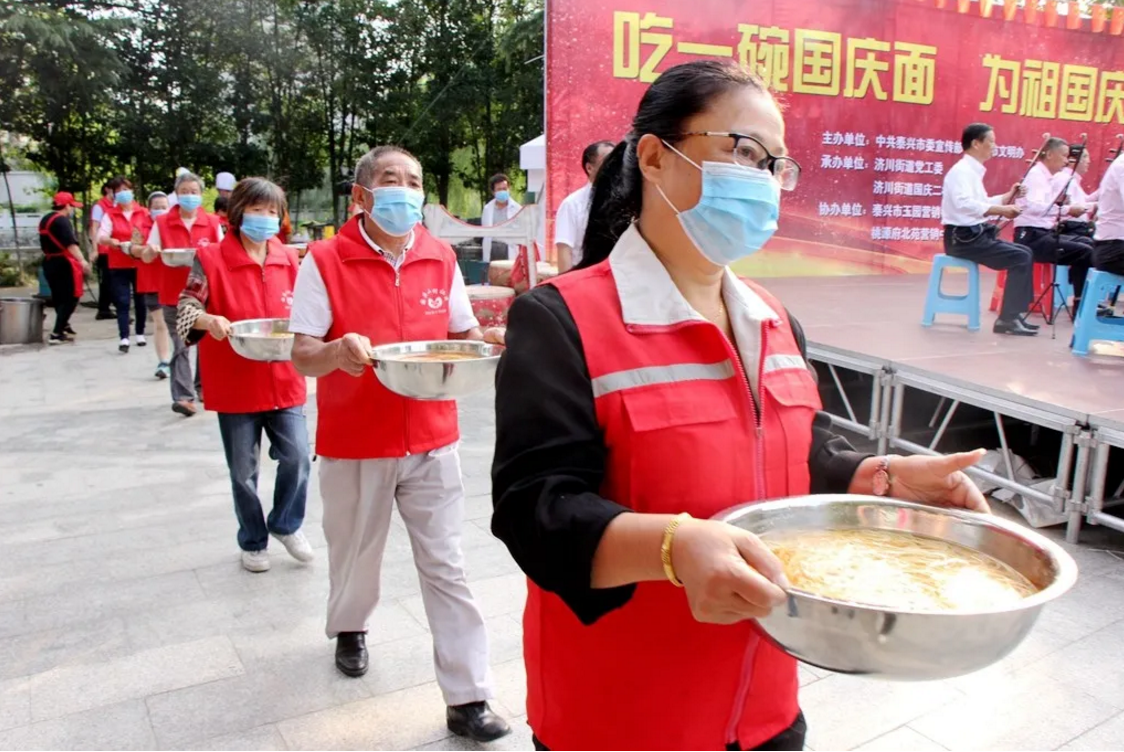 喜迎國慶,舉國同慶,今天,你吃“國慶面”了嗎?在中華人民共和國成立71周年之際,泰興市委宣傳部、文明辦、濟(jì)川街道、國慶二村社區(qū)、邀請(qǐng)市民同吃一碗“國慶面”。社區(qū)居民、醫(yī)護(hù)人員、人民教師、退伍軍人、環(huán)衛(wèi)工人、抗疫志愿者……來自各行各業(yè)的400多人,歡聚一堂,用同吃“一碗面”,這一最生活化的表達(dá)方式,為祖國母親慶祝生日。