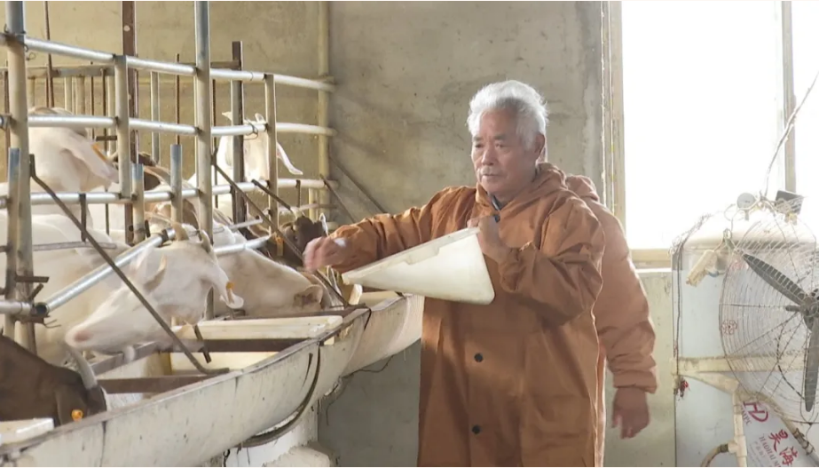 黃橋敬躍波爾山羊?qū)I(yè)合作社內(nèi),五保戶吳根泉正在羊舍內(nèi)喂養(yǎng)山羊。前幾年,黃橋敬躍波爾山羊?qū)I(yè)合作社進行了一次重新整合,吸收了南垈村35戶建檔立卡低收入戶加入其中,這也讓吳根泉有了一份穩(wěn)定的收入。
