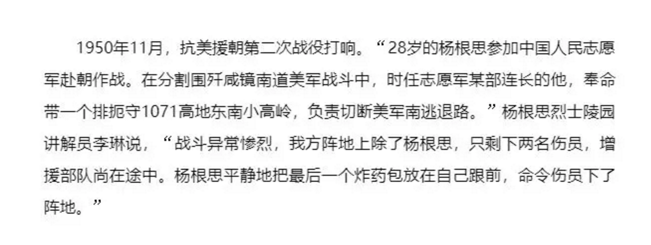 第二天拂曉,敵人發(fā)起了第九次沖鋒,幾十個(gè)美軍沖了上來。楊根思投完了所有的手榴彈,射出了最后一顆子彈后,猛地站起來,一把抱起十斤重的炸藥包,拉著了導(dǎo)火索,縱身沖向敵群……隨著驚天動(dòng)地的一聲巨響,楊根思的生命永遠(yuǎn)定格在了28歲。 故鄉(xiāng)更名為“根思鄉(xiāng)”