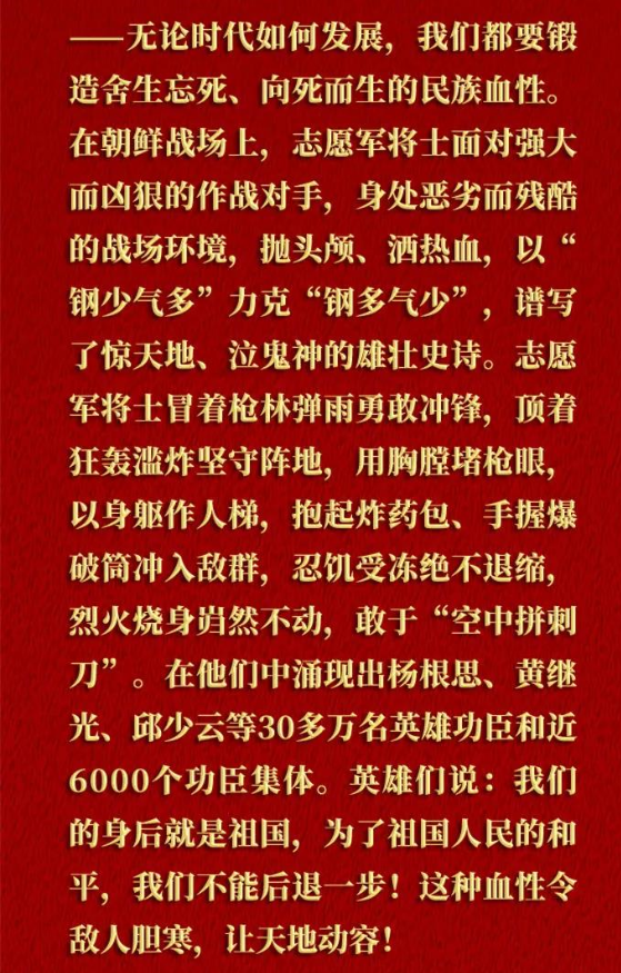 上午10點,紀念中國人民志愿軍抗美援朝出國作戰(zhàn)70周年大會在北京人民大會堂隆重舉行,習近平總書記出席大會并發(fā)表重要講話。在講到“鍛造舍生忘死、向死而生的民族血性”時,習近平總書記說:志愿軍將士中涌現(xiàn)出楊根思、黃繼光、邱少云等30多萬名英雄功臣和近6000個功臣集體。