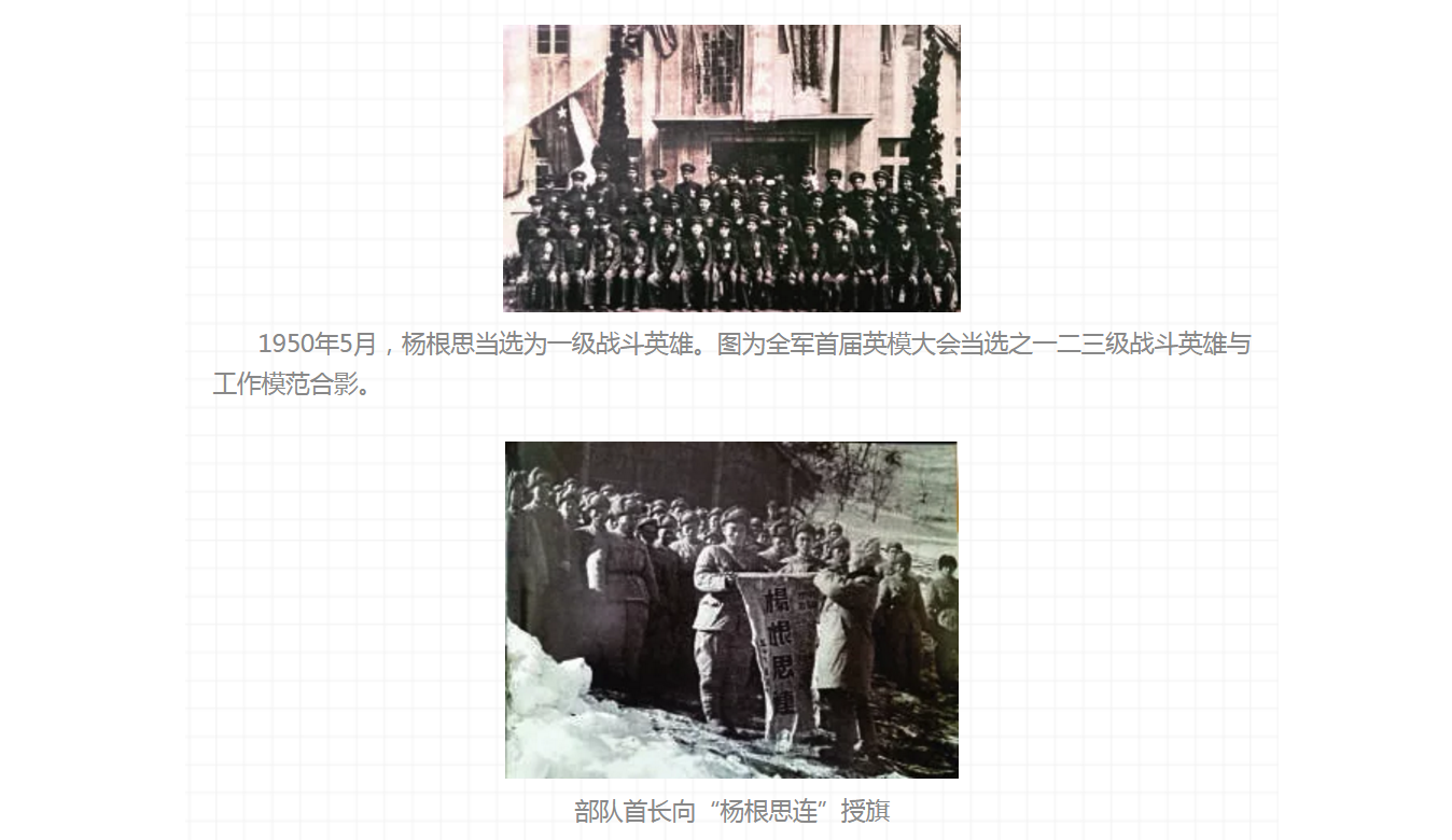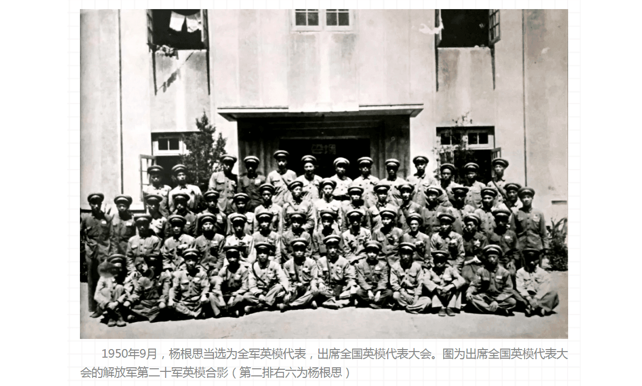 1950年春,全軍掀起了“學習文化”的熱潮。那時,楊根思所在部隊住在吳淞進行海上練兵。不管白天練兵多么疲勞,楊根思每天夜里總要堅持學習。他說:“不學好文化,就學不好革命的理論,學不好現(xiàn)代軍事科學。我要像打仗一樣炸開新的‘碉堡’。” 一天,他坐在一盞小煤油燈下學習,由于過度疲勞,帽沿被燒著了也不知道。團的《先鋒報》刊登了《楊根思學文化》的報道。師長在軍人大會上表揚了楊根思刻苦學習的精神,贊譽楊根思為全師的學習標兵。” 5月,楊根思參加了軍首屆英模大會。在這屆英模大會上,楊根思被評為一級戰(zhàn)斗英雄。隨后又提升為連長。1950年,他還被選為出席全國英模代表大會的代表,9月26日,楊根思和800多名戰(zhàn)斗英雄、勞動模范受到了毛主席和朱總司令的接見。