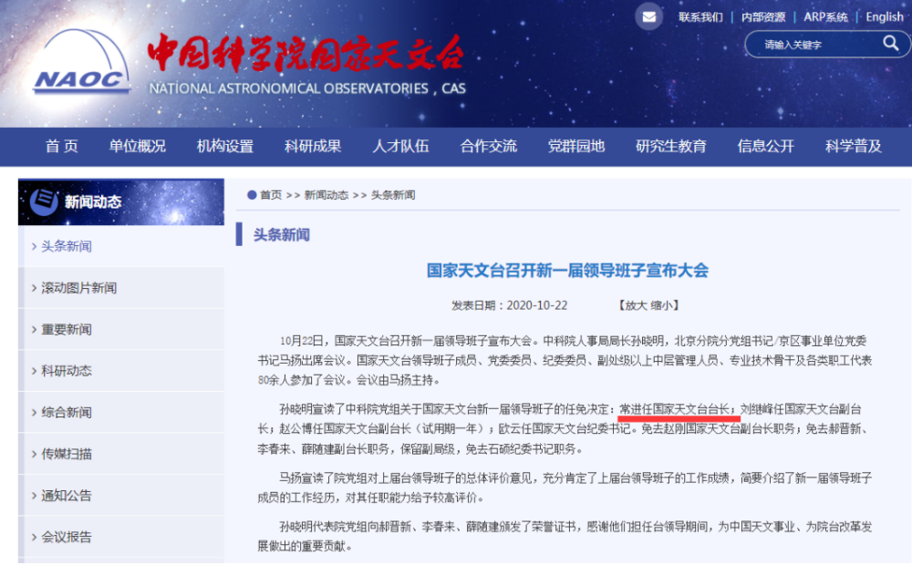 10月22日,國家天文臺新一屆領導班子宣布大會召開。會議宣布常進任國家天文臺臺長。