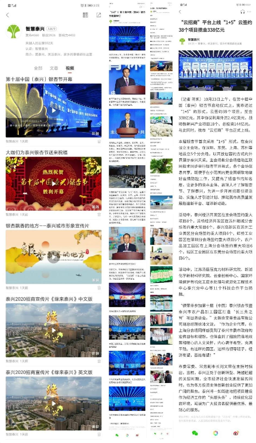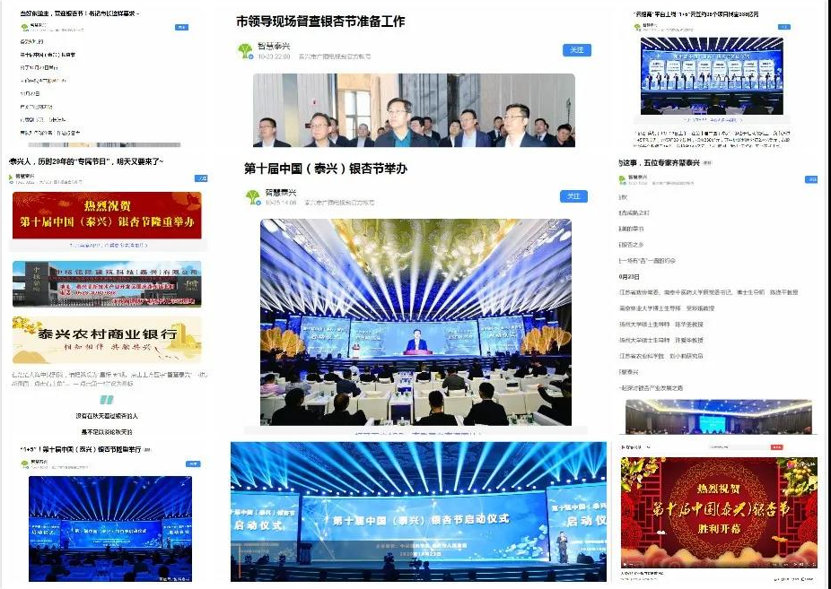 據(jù)不完全統(tǒng)計,連續(xù)5天省級、央視各平臺圍繞中國(泰興)銀杏節(jié)、泰興形象宣傳片等內容,陸續(xù)報道近30條(次),通過圖文、視頻等多種形式,展示了泰興城市形象和發(fā)展成就。