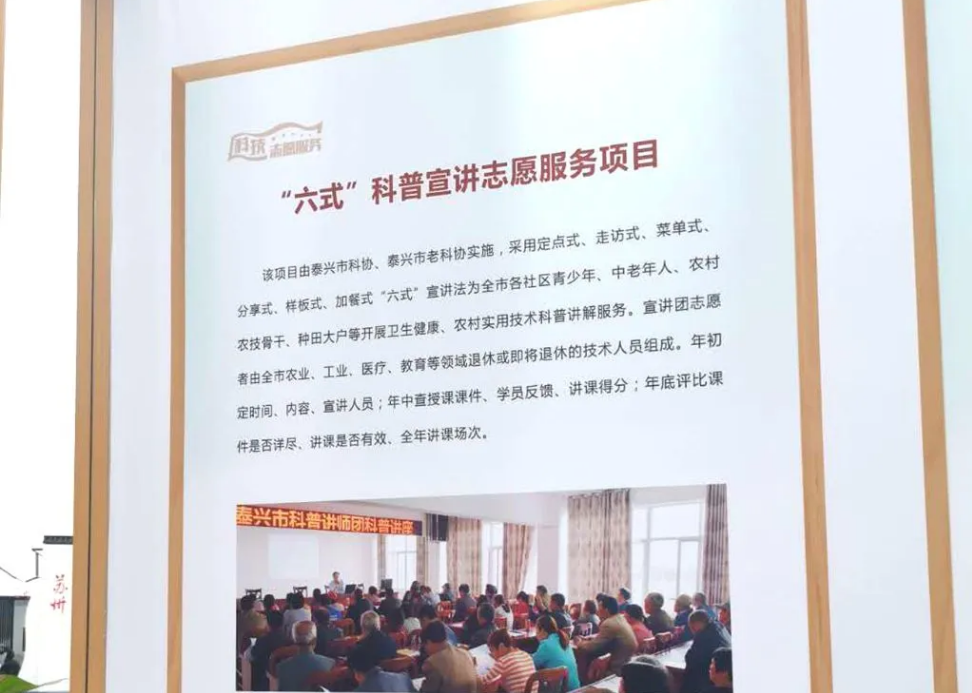 “六式”科普宣講志愿服務(wù)項目 該項目由泰興市科協(xié)、泰興市老科協(xié)實施,采用定點式、走訪式、菜單式、分享式、樣板式、加餐式“六式”宣講法為全市各社區(qū)青少年、中老年人、農(nóng)村農(nóng)技骨干、種田大戶等開展衛(wèi)生健康、農(nóng)村實用技術(shù)科普講解服務(wù)。宣講團(tuán)志愿者由全市農(nóng)業(yè)、工業(yè)、醫(yī)療、教育等領(lǐng)域退休或即將退休的技術(shù)人員組成。