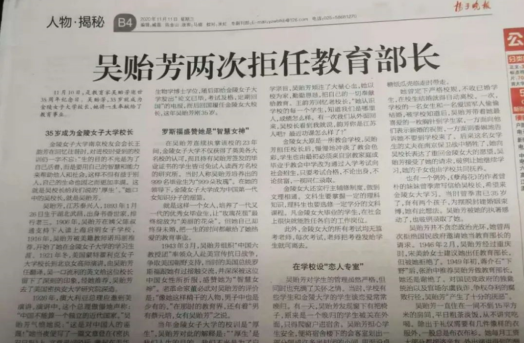 2020年11月10日 吳貽芳逝世35周年紀(jì)念日 11月11日 揚子晚報刊登 《吳貽芳兩次拒任教育部長》 緬懷和學(xué)習(xí)她的光輝業(yè)績與高尚品德