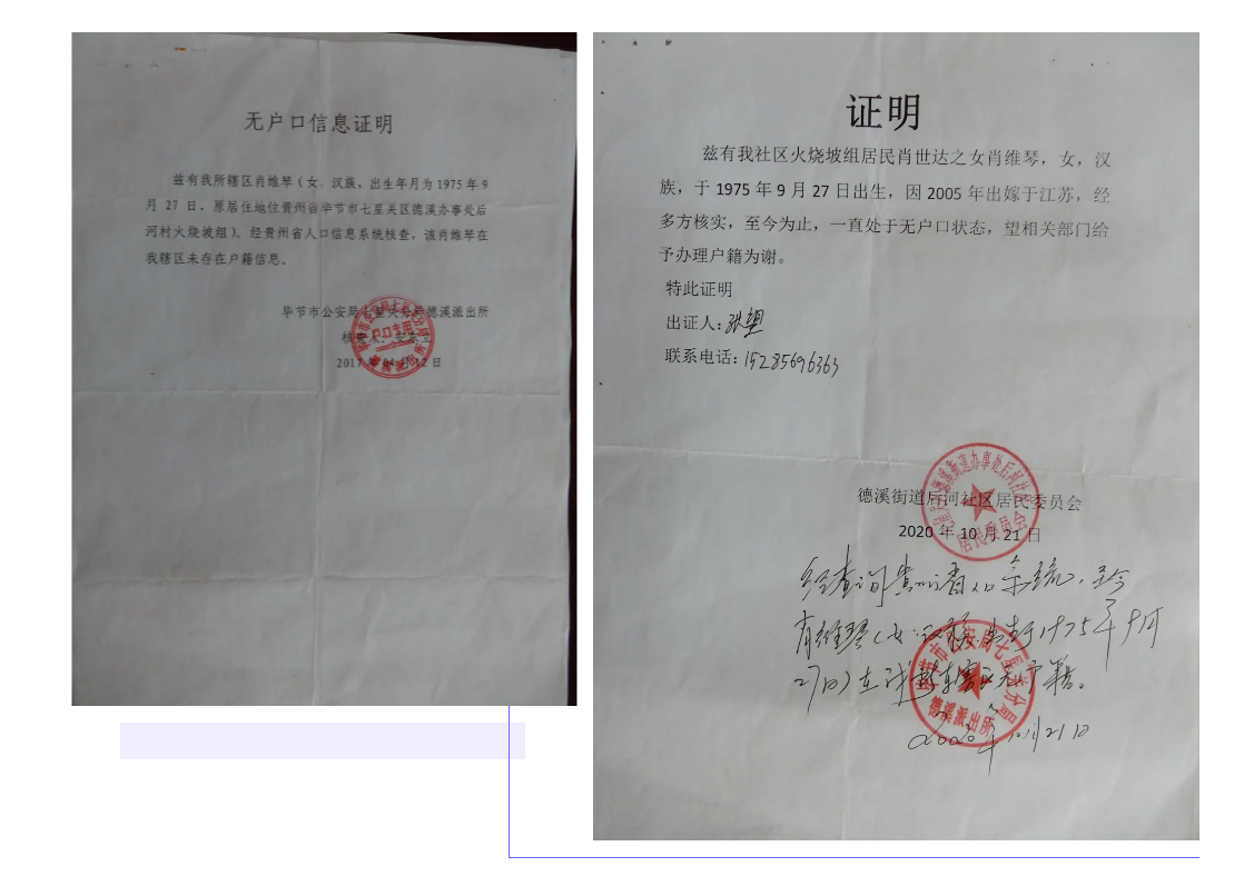 民警通過戶籍以及全國人口信息核查,均未能查詢到肖維琴的相關(guān)信息,也無法查詢到當?shù)嘏沙鏊男畔。于是民警通過肖維琴提供的兄弟姐妹姓名信息和當事人辨認,找到了貴州省畢節(jié)市原籍所屬派出所聯(lián)系方式。通過連線貴州省畢節(jié)市當?shù)嘏沙鏊,確認由于其家庭兄弟姐妹多、地理環(huán)境復雜以及歷史問題等諸多因素,肖維琴竟然從未申報過戶口。