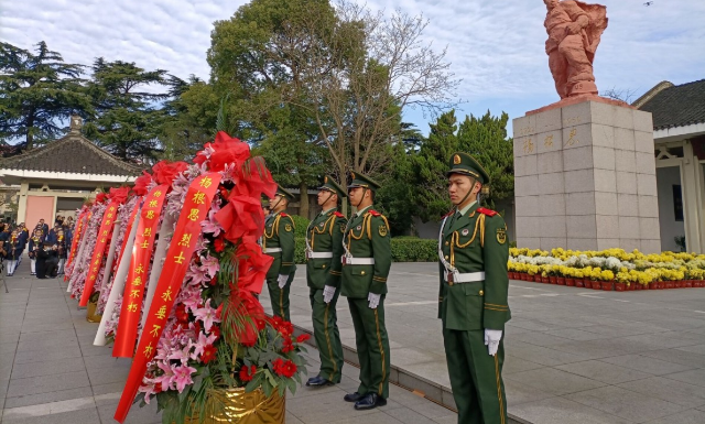 在深情的《獻(xiàn)花曲》中,16名禮兵護(hù)送8個(gè)大型花籃,緩步走向楊根思烈士巨型塑像,將花籃整齊地?cái)[放在塑像前。史立軍、徐衛(wèi)緩步上前,仔細(xì)整理花籃緞帶,表達(dá)對(duì)楊根思烈士的哀思。隨后,全體人員參觀了楊根思烈士史料陳列館,并向楊根思烈士衣冠冢敬獻(xiàn)鮮花。