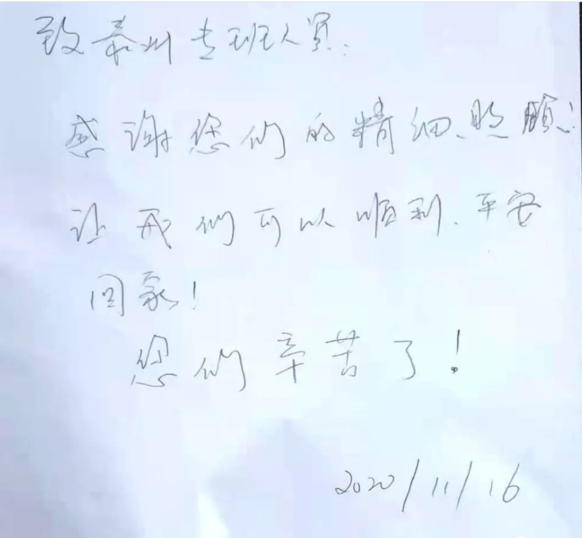 丁衛(wèi)鋒回憶說(shuō),有一天,他們接到一位從國(guó)外回泰州的旅客,對(duì)方是一位孕婦,還帶著她的女兒,隨身行李也特別多。丁衛(wèi)鋒從轉(zhuǎn)運(yùn)點(diǎn)接到母女倆后,幫助他們安頓好了行李,在返回泰州的路上,一路上幫助他們解決各種出行難題,并且叮囑他們到泰州隔離點(diǎn)后的注意事項(xiàng)。被丁衛(wèi)鋒他們的溫暖服務(wù)感動(dòng),下車后,旅客給他們寫了個(gè)紙條,“感謝你們的精細(xì)照顧,讓我們能夠順利、平安回家。”丁衛(wèi)鋒將這張紙條拍照放在手機(jī)里,他說(shuō)他們的服務(wù)得到旅客的認(rèn)可,并且能夠在“抗疫”前線守護(hù)人民的健康,讓大家安心工作生活,這樣的辛苦很值得!