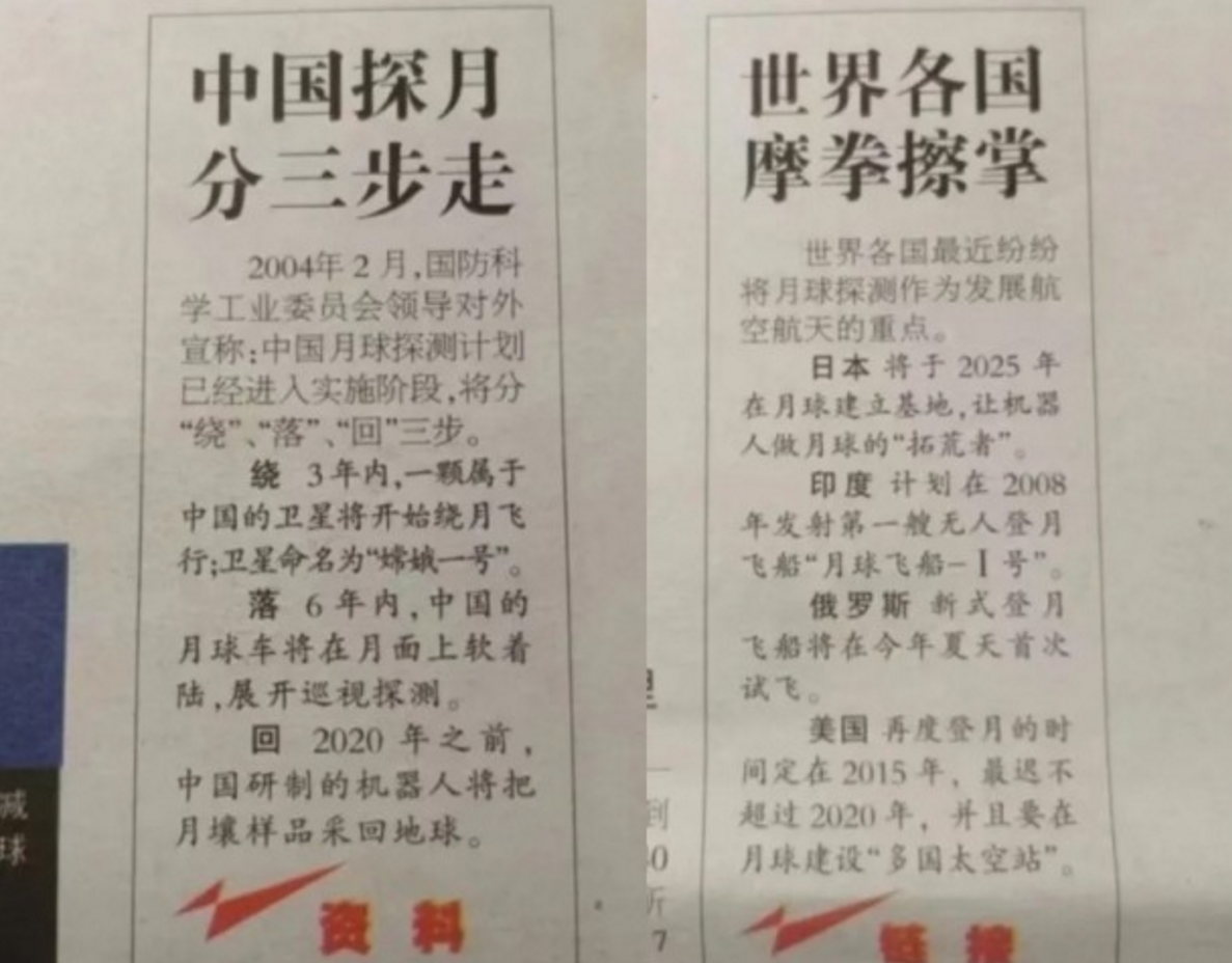 這是一張2005年的《科學發(fā)現(xiàn)報》,上面寫著:“3年內(nèi)一顆屬于中國的衛(wèi)星將開始繞月飛行;6年內(nèi),中國月球車將在月面軟著陸;2020年之前,中國研制的機器人將把月壤樣品采回地球。”