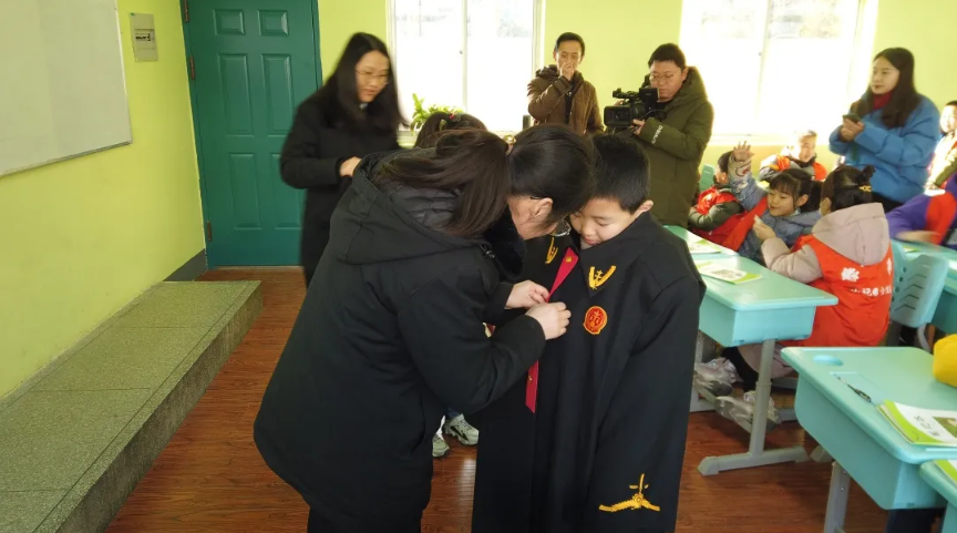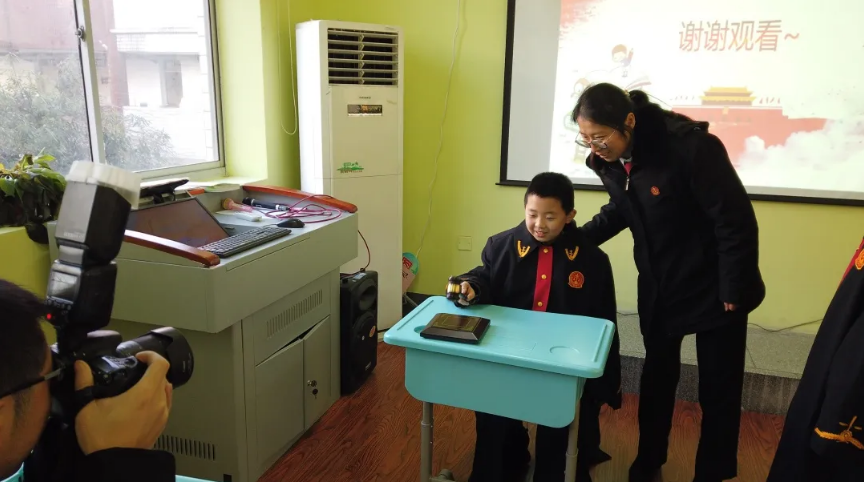 民一庭還為小記者、小主播帶去了法袍及法槌,同學(xué)們積極踴躍試穿法袍、敲擊法槌,體驗一名小“法官”的快樂。