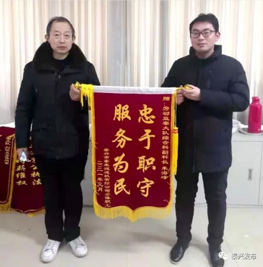 包工頭孔某代表9名農(nóng)民工來到泰興市勞動(dòng)監(jiān)察大隊(duì),送上繡著“忠于職守、服務(wù)于民”的錦旗。