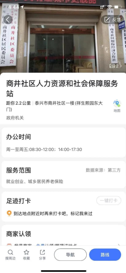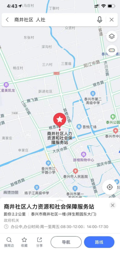 “人社電子地圖”功能借助高德電子地圖開放接口,實現(xiàn)泰興市級、鎮(zhèn)街、社區(qū)(村)人社三級服務(wù)網(wǎng)絡(luò)公共服務(wù)機構(gòu)電子地圖定位,具有直觀、可視的特點。高德地圖用戶只需搜索所在的村或社區(qū)加關(guān)鍵詞“人社”,就可以獲取最近的人社服務(wù)站地點。地圖不僅能提供就近辦事地點查詢及路線導(dǎo)航的服務(wù),還提供服務(wù)機構(gòu)詳細地址、辦事時間及服務(wù)事項等信息,為辦事群眾及企業(yè)提供更為清晰明確的指引。