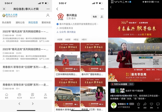 從1月31日開(kāi)始,泰興2022年“春風(fēng)送崗”系列網(wǎng)絡(luò)招聘活動(dòng)矩陣式鋪開(kāi)。打開(kāi)電視,重點(diǎn)骨干企業(yè)招聘用工宣傳片,特別亮眼;翻開(kāi)報(bào)紙,崗位招聘信息,分門(mén)別類;搜索網(wǎng)絡(luò),“泰興人才網(wǎng)”招聘專區(qū),映入眼簾;點(diǎn)擊微信,“泰興就業(yè)”小程序,刊發(fā)動(dòng)態(tài)崗位信息;“智慧泰興”視頻號(hào),“青春泰興·職等你來(lái)”直播帶崗“面對(duì)面”……